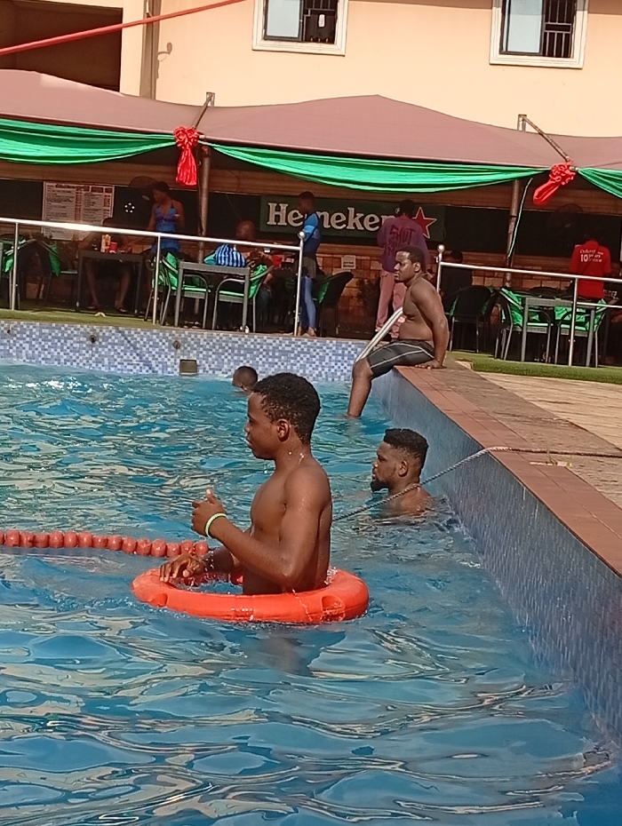 Several people are enjoying a sunny day at an outdoor swimming pool. A man wearing a bright orange inflatable tube is standing in the water and gesturing with his hand. Another man is sitting on the edge of the pool. A rope floats across the pool's surface. In the background, people are seated at tables under a green-draped awning with a Heineken sign. A two-story building stands behind the awning.