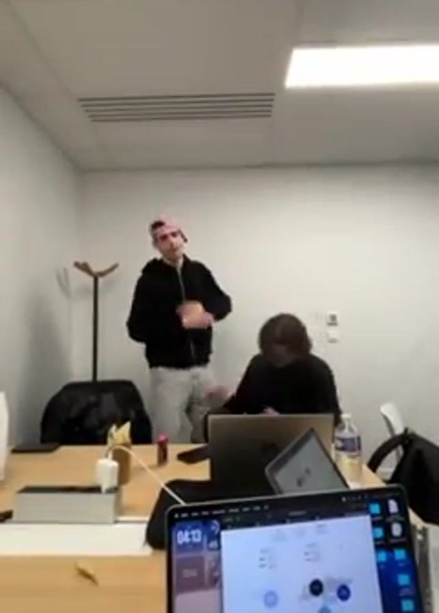 A brief video depicts two young men in what appears to be an office. One stands near a desk, wearing a black zip-up hoodie, light gray pants, and a pink baseball cap. He is moving his body rhythmically, seemingly dancing or warming up. The second man is sitting at the desk, wearing black clothing and working on a laptop. There are two open laptops on the desk, along with a water bottle, charging cables, and other small items. A coat rack with a black bag on it stands in the background, along with plain white walls and a fluorescent ceiling light. The video is shot from the perspective of someone seated at the desk, likely filming with a mobile phone. There is music playing in the background.
