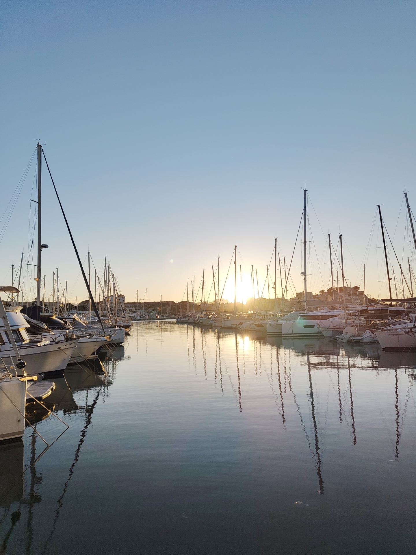 The image depicts a harbor at sunset in Dénia, Spain. Multiple sailboats are docked, their masts rising high against the clear blue sky tinged with golden light from the setting sun. The water in the harbor is calm, reflecting the masts and boats. Buildings are visible in the background, silhouetted against the sun. The scene is serene and captures the peaceful atmosphere of a harbor at dusk.