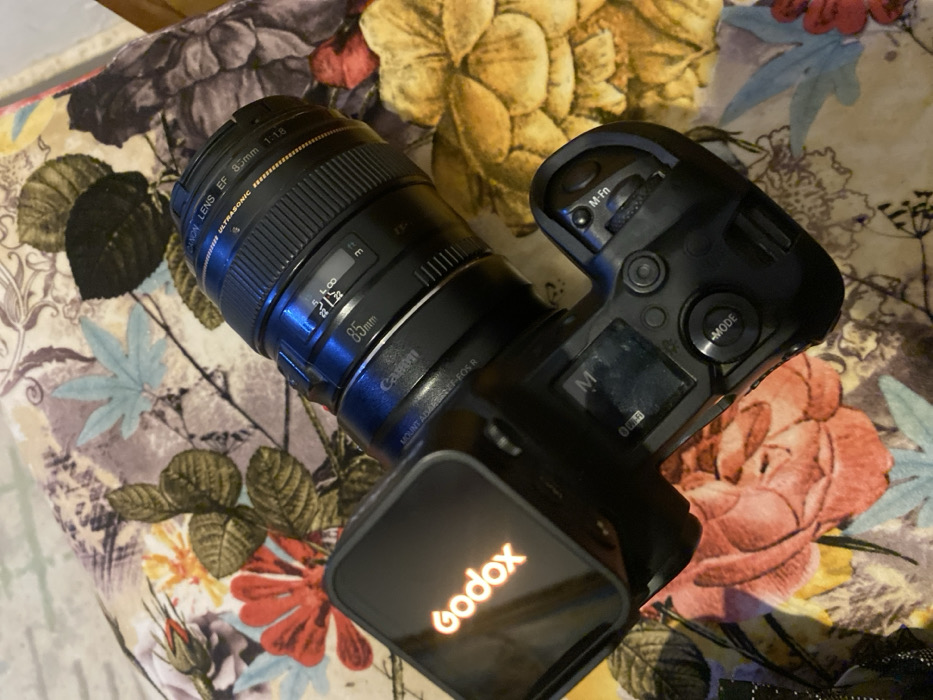 A black Canon camera body, featuring an "M" on its top display, is equipped with a black Canon EF 85mm 1:1.8 USM lens via an EF-EOS R mount adapter. A black Godox flash trigger, displaying an illuminated orange "Godox" logo on its screen, is mounted in the camera's hot shoe. The camera assembly rests diagonally on a multicolored fabric surface patterned with large, stylized floral and leaf motifs in shades of red, yellow, pink, blue, and green. There is no visual evidence within the image to confirm the location as Jos, Nigeria.