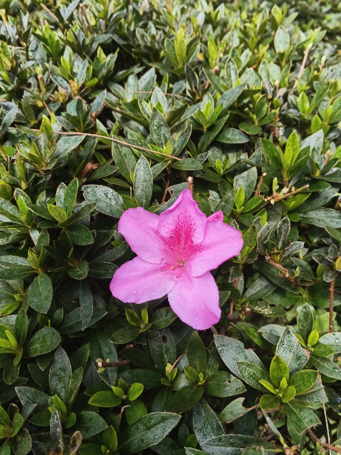 A vibrant pink azalea blossom, speckled with tiny water droplets, nestles amidst dense green foliage