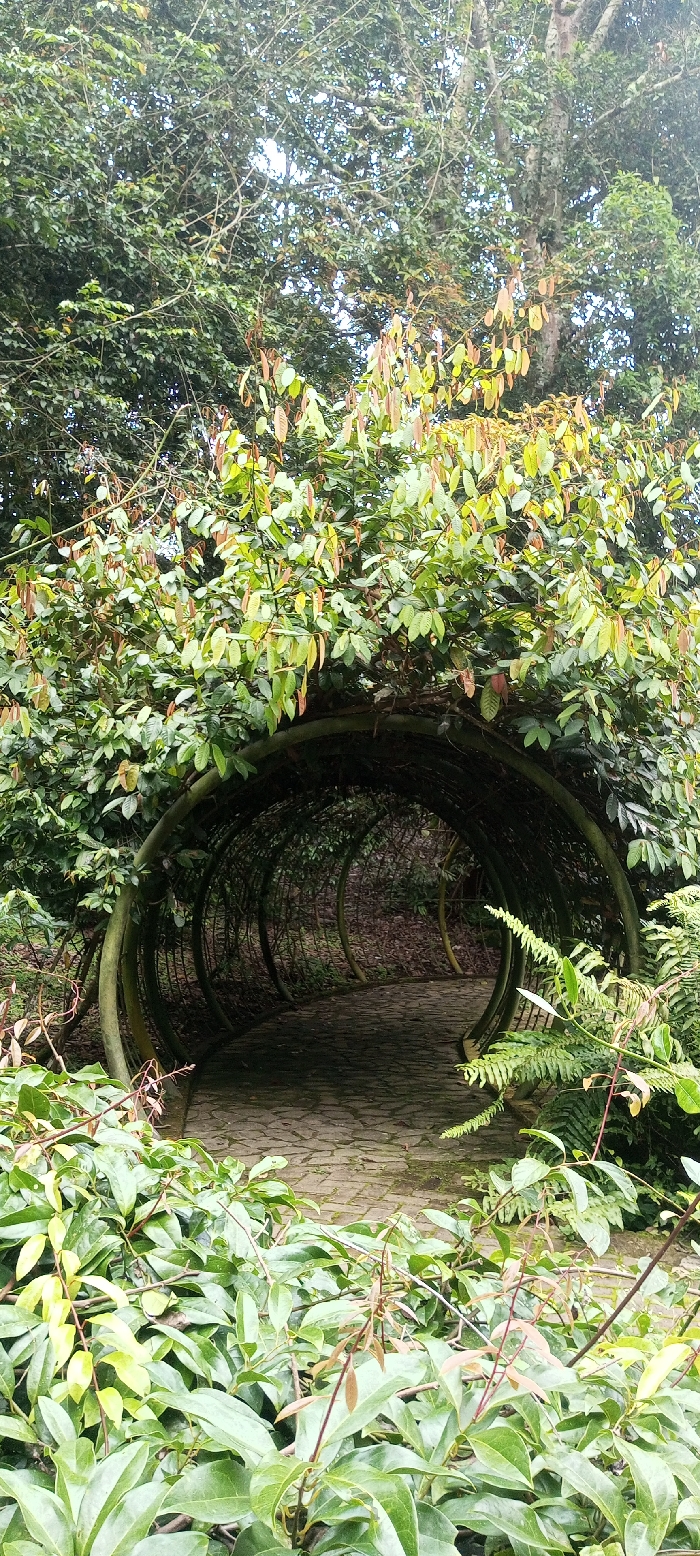 The image depicts a verdant, outdoor scene in Kanand, India, featuring a natural tunnel structure over a paved pathway. A dark green or brown lattice-like tunnel, composed of a series of curved arches, extends from the foreground into the background, curving slightly to the right. This tunnel is heavily overgrown with dense green foliage, interspersed with lighter green and reddish-brown leaves, creating a leafy canopy. Beneath the tunnel, a stone or brick pathway, possibly wet or mossy, is visible. The foreground is filled with various green plants, including ferns and shrubs, framing the entrance to the tunnel. In the background and upper portion of the image, numerous tall trees with dense green canopies dominate, with glimpses of a brighter, possibly overcast, sky through the leaves. No individuals or animals are present.