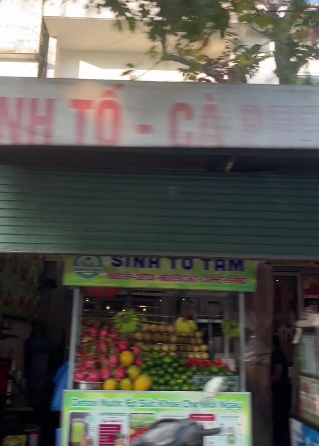 quick pan of roadside businesses and buildings from a vehicle, likely a car or motorcycle, moving along a street. The first business observed is a food or beverage stand, "TAM," displaying fresh fruits like avocados. The next is a two-story building, "CỬA HÀNG ĐẠT TẤN," with an open-air retail area underneath, selling plants and gardening supplies. The sky is visible in the background.