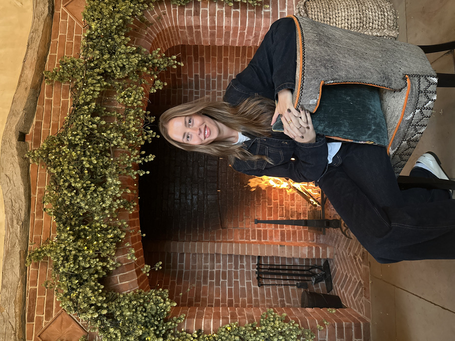 A woman with long blonde hair sits in a chair near a brick fireplace, smiling at the camera. The fireplace is adorned with lush green garlands. A fire burns brightly inside the fireplace. She wears a dark denim jacket and jeans, with a white shirt underneath. Her hands are folded in her lap. Part of a woven basket and chair are visible behind her.