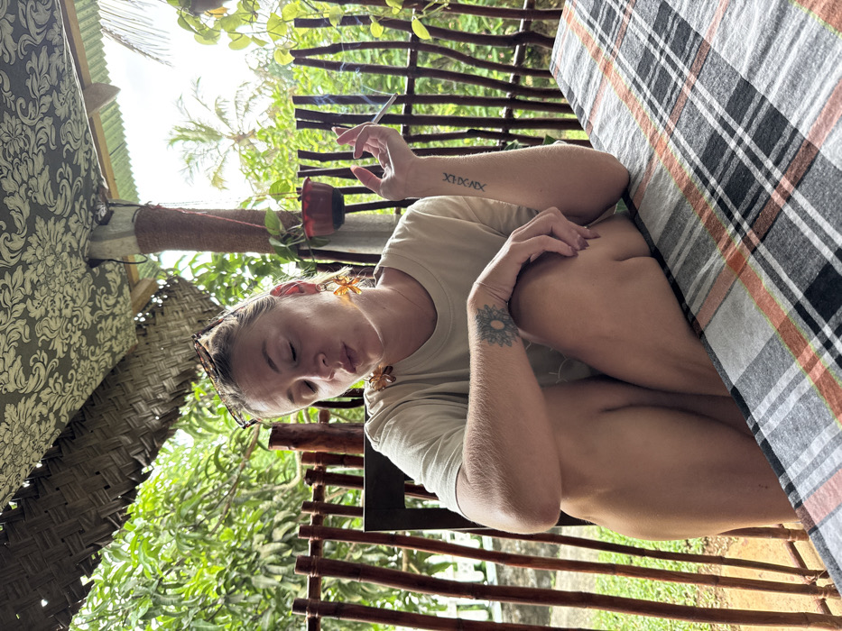 An adult female is depicted seated at a table on an outdoor veranda in Nilwella, Sri Lanka. She has blonde hair, with sunglasses resting atop her head, and is wearing a light-colored t-shirt. Her left forearm displays a circular mandala-style tattoo, and her right forearm bears Roman numerals "XIX.X.IX". She wears large, amber-colored, butterfly-shaped earrings. She is holding a lit cigarette between the index and middle fingers of her right hand, from which smoke is visibly rising. Her eyes are partially closed, and her mouth is slightly open, consistent with exhaling smoke. Her left leg is bent, with her left forearm resting on her knee. The table is covered with a plaid tablecloth featuring black, white, and orange squares. The background consists of lush green tropical foliage, including trees and a palm visible against a bright, overcast sky. A rustic fence made of vertical wooden poles is present behind her. Above, a patterned fabric ceiling is visible, along with a woven mat ceiling section and a support column wrapped in reddish material from which a potted plant hangs.
