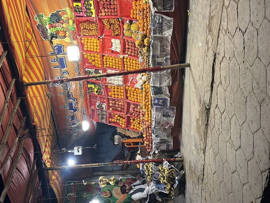 A vibrant fruit stand displays rows of oranges, apples, kiwis, and other produce in red containers. A man in a white shirt and vest sits near hanging bananas. The stand is covered by a striped awning with Arabic script. The ground is a gray, cracked tile surface.
