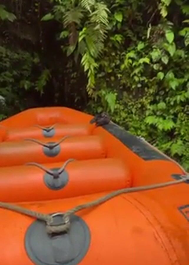n orange inflatable raft with a weathered rope tied to its front. In the background, a dense wall of lush green vegetation suggests a tropical or rainforest environment. Perched on the raft is a small, scruffy black chicken with a visibly red head. The chicken appears disheveled, with its feathers ruffled and sparse in places. It looks directly at the camera, displaying a weary or distressed appearance.