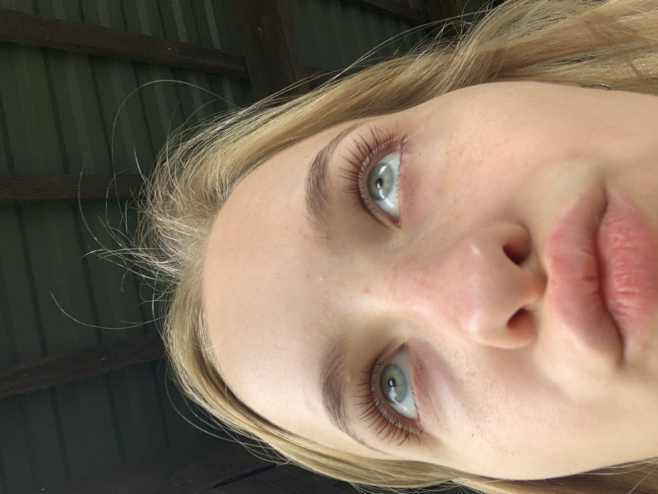 A close-up, low-angle portrait depicts a young female located in Yasinia, Ukraine. The subject's face dominates the frame, exhibiting fair skin with numerous freckles distributed across the nose and cheeks. Blond hair is visible at the top of the forehead, characterized by several distinct flyaway strands. The subject's light blue eyes are directed upwards, beneath light brown eyebrows and notably long, curled eyelashes. The lips are tightly pursed into a prominent pout. A small, circular silver earring is visible on the subject's right earlobe. The background is out of focus, revealing a dark overhead structure composed of visible wooden beams and a dark, corrugated ceiling or roof material.