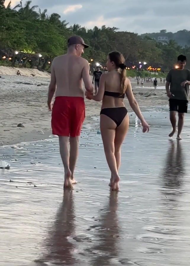 A man and a woman are walking along a beach. The man is wearing red shorts and a baseball cap. The woman is wearing a black bikini. They are holding hands. The beach is wet, and their reflections are visible in the water. Other people are visible in the background, walking on the beach and enjoying the sunset. Palm trees and lights line the background. The sky is overcast.