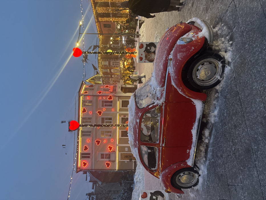 A red Citroen 2CV is parked on a snowy street, partially covered in snow. In the background, buildings are decorated with Valentine's Day themed lights, featuring red hearts and garlands. Street lamps with large red heart-shaped decorations stand prominently. A sign with cats is near the car, and people are walking in the distance amid the festive ambiance. The scene suggests a celebration taking place in a snowy urban setting.