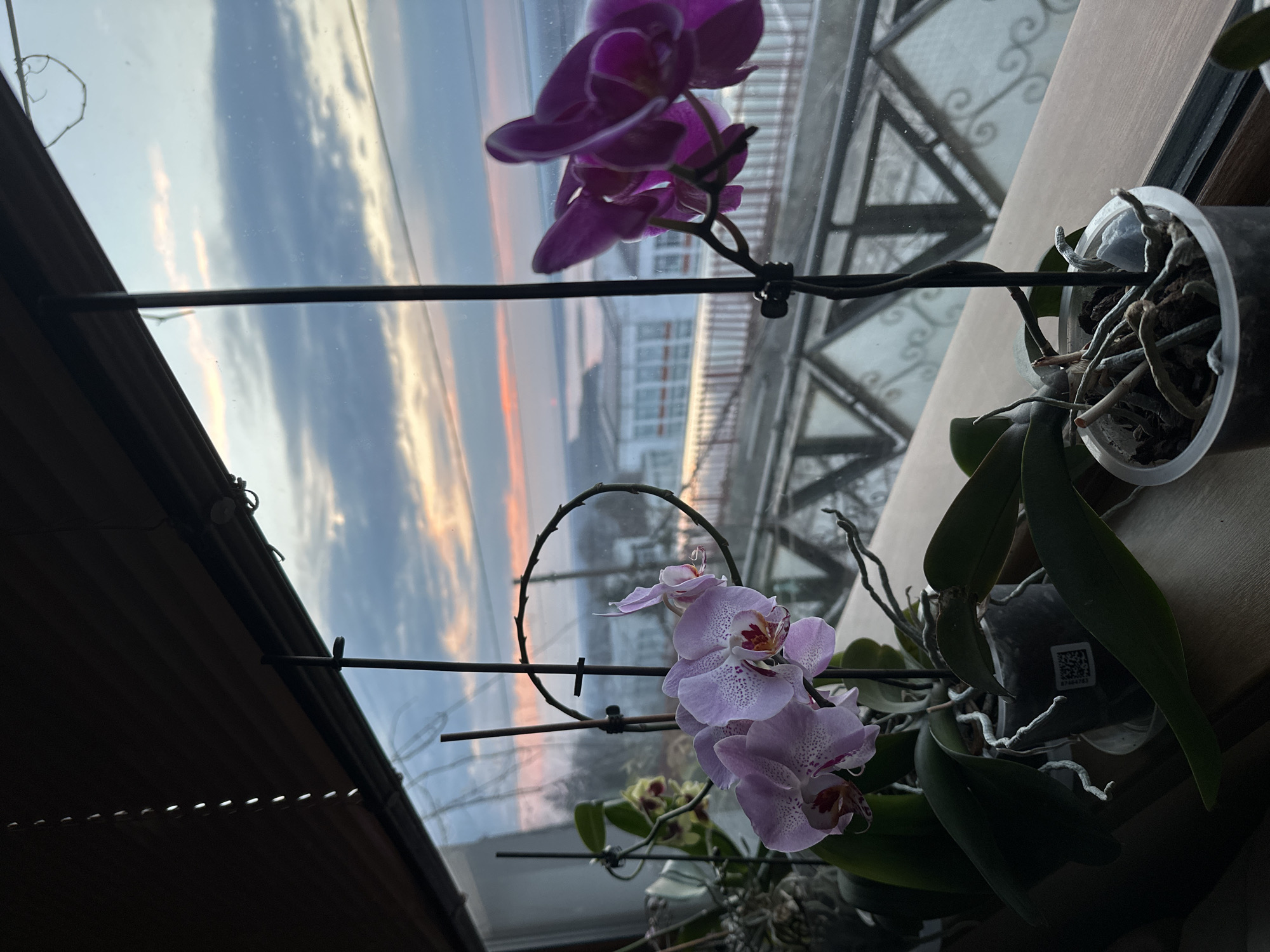 The image presents a static, interior-to-exterior view from a window located in Tutrakan, Bulgaria. In the foreground, a wooden window sill supports multiple potted Phalaenopsis orchid plants. The most prominent orchid, situated left-of-center, displays light purple flowers with dark speckles and reddish-orange centers. This plant is supported by dark stakes and a circular wire structure. Its translucent pot reveals visible aerial roots and potting medium, with a QR code affixed to its side. To the right, another orchid with darker purple blooms is partially visible and slightly out of focus. A third, less defined orchid is partially visible to the far left. Dark, horizontal window blinds are partially drawn in the upper left portion of the window frame. Through the window, a dark, decorative metal railing featuring geometric and scroll patterns extends horizontally across the midground. Beyond the railing, a cityscape unfolds with light-colored buildings on a gently sloping terrain. In the background, a wide body of water, identified as the Danube River, is visible, reflecting the sky's colors. The sky above is characterized by a blend of blue, grey, and distinct pink-orange clouds near the horizon, indicative of either sunrise or sunset. No individuals are present in the scene.