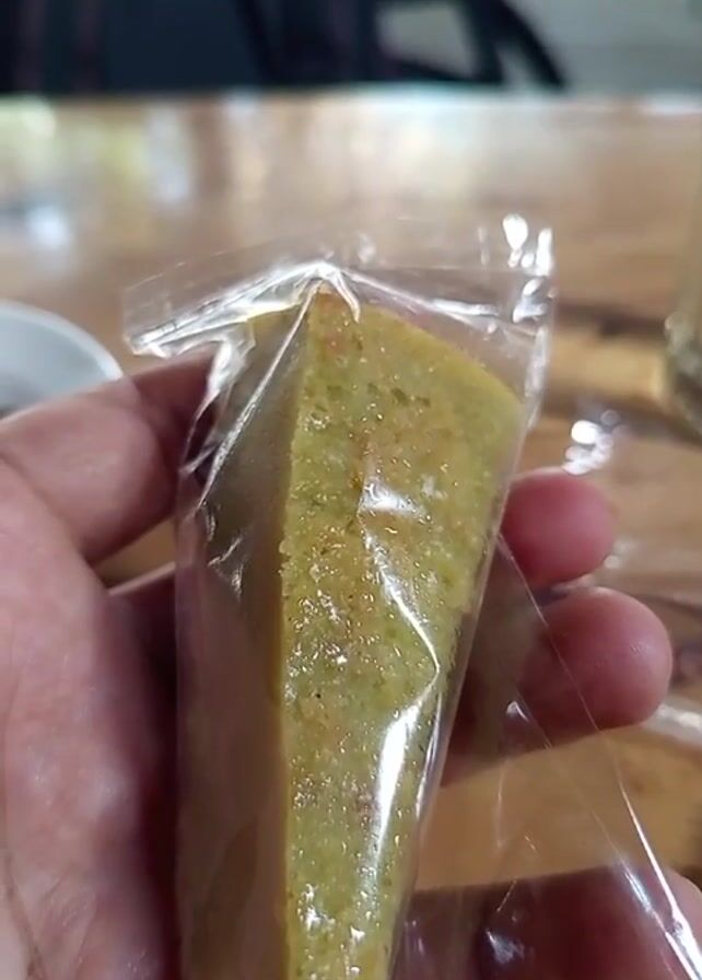 A hand holds a wedge-shaped piece of green cake in a clear plastic bag