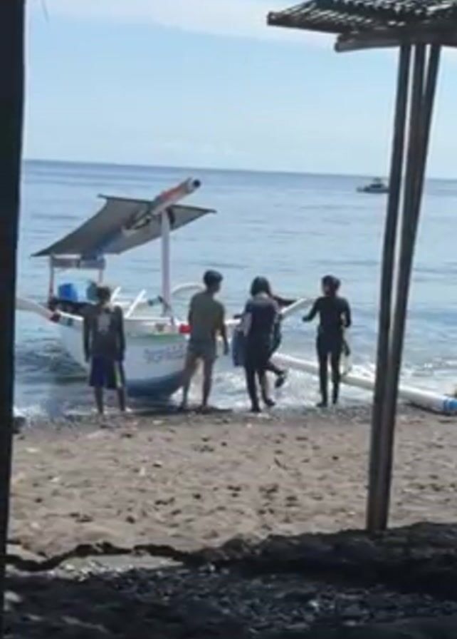 The scene shows a group of five people on a black sand beach near a white outrigger boat
