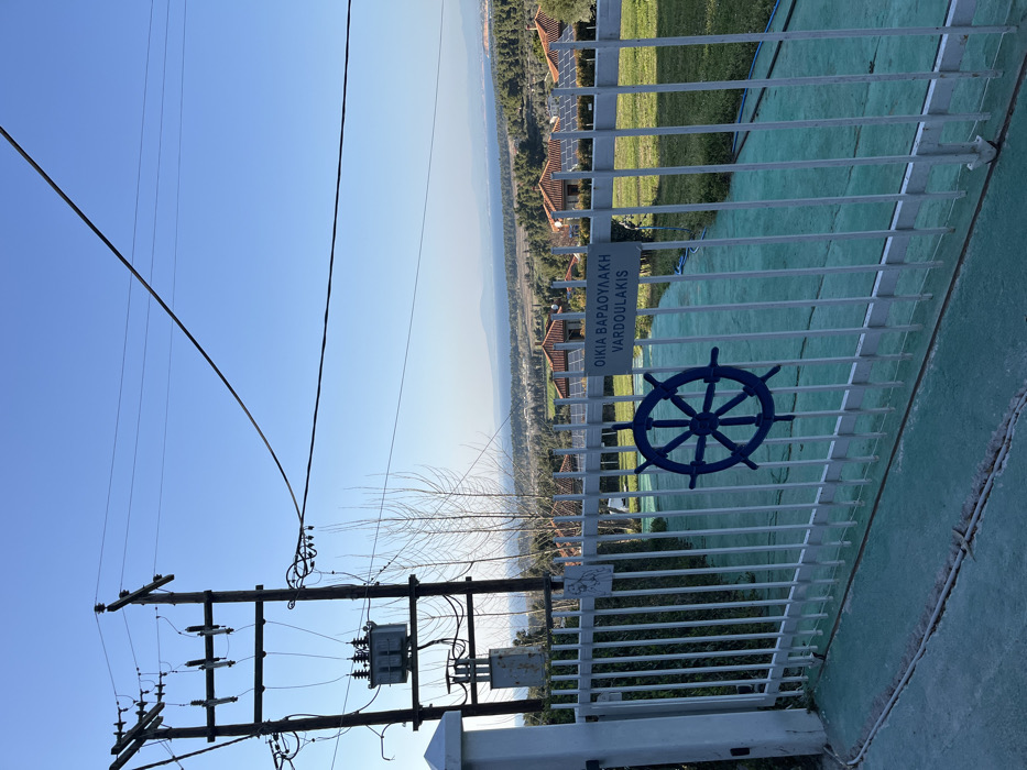 The scene depicts an outdoor, elevated perspective within the Kassandra Municipal Unit, Greece, under clear daylight. In the foreground, a white metal vertical bar fence is prominent, adorned with a blue ship's wheel emblem and a rectangular sign reading "ΟΙΚΙΑ ΒΑΡΔΟΥΛΑΚΗ VARDOUDAKIS" in Greek and English. The ground immediately beneath and in front of the fence is a teal-colored surface with a visible crack near the bottom edge. To the left, a dark wooden utility pole supports multiple crossarms, insulators, numerous electrical wires, and two vertically stacked transformers. Beyond the fence, a manicured green lawn transitions into a landscape featuring scattered buildings with orange-ttiled roofs, some equipped with solar panels, and various trees, some of which are deciduous and bare. In the mid-ground, a broad expanse of calm blue water, consistent with a sea or large bay, is visible, with a landmass rising distinctly on the far horizon beneath a cloudless blue sky. No individuals are present.