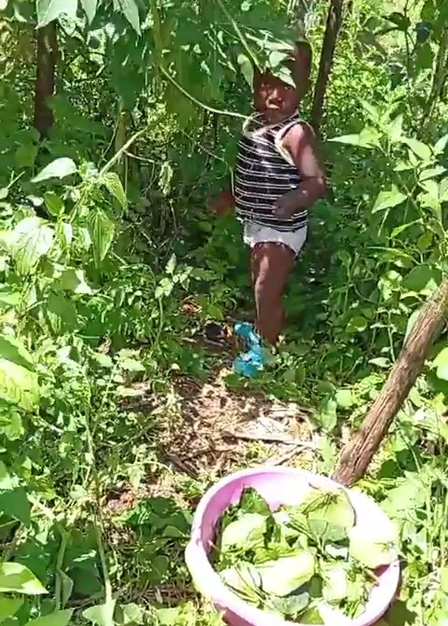 A toddler, dressed in a striped tank top, diaper, and blue shoes, stands amidst lush green vegetation in an outdoor setting. A pink bowl filled with green leaves sits in the foreground. The child looks directly at the camera, interacting with string or plant life. The surroundings consist of various green plants and a wooden stick. Sunlight filters through the foliage.