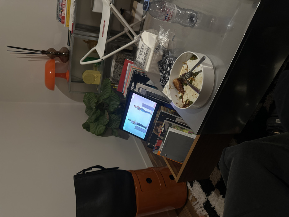 The image depicts an indoor living space within a residence located in Saint-Ouen-sur-Seine, France, viewed from a low, seated perspective. In the immediate foreground, the knees and lower thighs of an individual wearing dark grey trousers are visible. A metallic rectangular coffee table occupies the central midground. On its surface rests a white, round dish containing remnants of a meal, specifically a dark sauce, green vegetables, and a piece of cooked meat, along with two forks. Adjacent to the dish are a crumpled black and white patterned napkin, a transparent plastic package labeled "LES SERVIETTES OUEST," and a partially empty plastic bottle of Evian mineral water. To the left of the coffee table, a wooden magazine rack holds several magazines and books. A laptop computer, with its screen illuminated, is propped within the rack. The screen displays two male figures in athletic attire, positioned against a neon-gradient background featuring blue and pink hues. Further to the left, a black shoulder bag is placed atop an orange cylindrical storage unit with two drawers. A black and white checkered rug is partially visible on the floor next to this unit. In the background, against a plain, light-colored wall, a two-tiered metallic shelving unit is present. The top shelf features an orange mushroom-shaped table lamp, a dark brown, undulating vase containing several black diffuser reeds, and a stack of books, one of which is visibly titled "SNEAKERS ADDICTS." The bottom shelf holds a potted plant with large, textured green leaves and a small yellow cylindrical object. A white folding chair with a red "Supreme" logo on its backrest leans against the right side of the shelving unit.