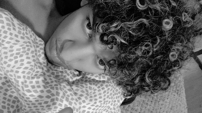 The monochrome image displays a close-up portrait of a single individual, identified as a young male, positioned from the upper chest to the top of the head. He possesses dark, tightly curled hair with distinct lighter highlights, forming prominent ringlets. His gaze is directed forward towards the camera, with dark eyes exhibiting reflected light and a seemingly neutral expression. Facial features include a prominent nose, full lips, and a visible light growth of stubble along the chin and jawline. The subject's left shoulder and upper chest are bare. He is partially covered by a patterned fabric, resembling a blanket or duvet cover, which features a repeating design of small, light-colored diamond or rhomboid shapes on a darker base. The background elements suggest an indoor setting: a textured surface, possibly carpet or upholstery, is visible in the upper right, and a dark, indistinct angled object, consistent with furniture, is in the upper left. No specific geographical markers or contextual details are present within the image to determine a location within Kamenz - Kamjenc, Germany, or any other specific city.