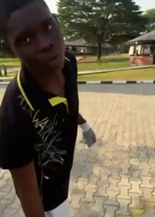 man outside gesturing to stop the camera recording. He's wearing a dark green shirt and black pants with a harness. A group of people are walking away from the camera in the background. The location appears to be an outdoor courtyard with trees, buildings, and patterned paving stones.