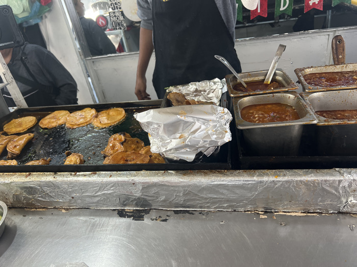A food vendor prepares street food. The cooking area is a griddle where round flatbreads and savory meat pieces are cooking. Sauces are kept warm in metal containers. One has a serving spoon. The vendor is wearing an apron, and another person in a jacket is on the left. The front of the cooking station is covered with silver foil.