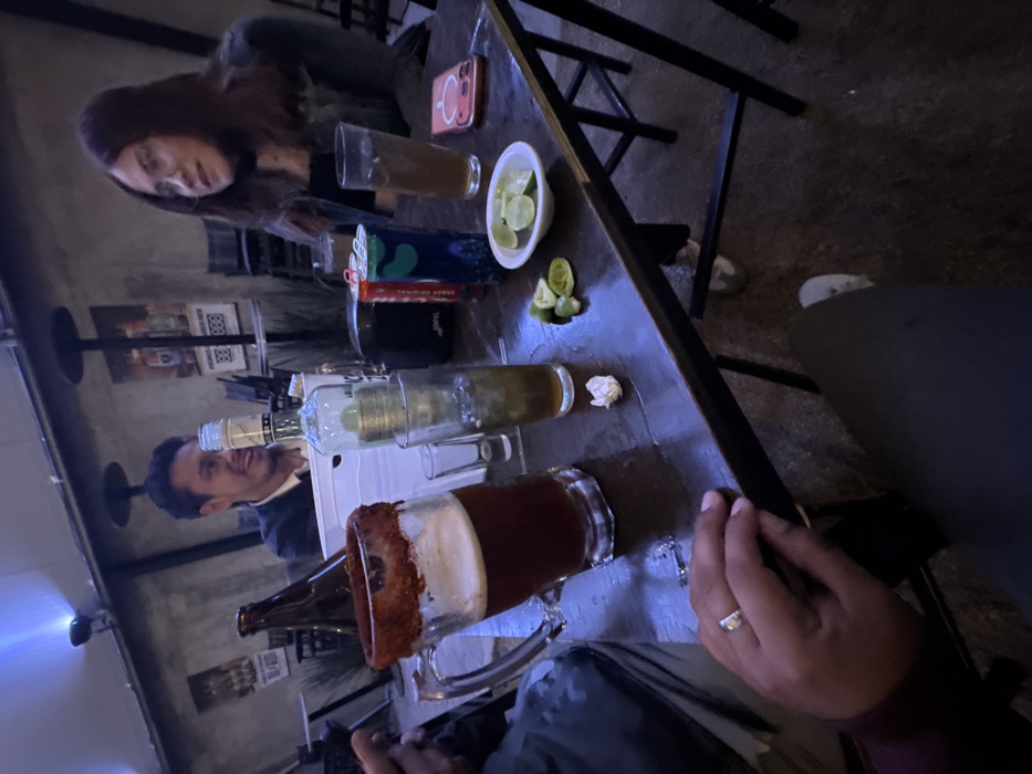 The image depicts an indoor/outdoor bar or restaurant scene at night in San Andrés Cholula, Mexico. Three individuals are visible around a dark rectangular table. A male with dark hair, wearing a light shirt and dark jacket, is seated on the far side, smiling and looking towards the right. To his right, a female with long dark hair, wearing glasses and a dark jacket, is seated, looking towards the left. In the immediate foreground, a person's left hand, adorned with a silver ring on the ring finger, rests on the table. The dark-colored tabletop is cluttered with various beverages and items. From left to right: a large glass mug containing dark amber beer with a chili-powder rim; a brown glass beer bottle; a white ice bucket holding a clear glass bottle of spirits; a small empty shot glass; a tall glass containing a light amber liquid with ice; a crumpled piece of white paper; a red beverage can (Coca-Cola) and a blue/green beverage can (Jarritos); a small white bowl filled with lime wedges, accompanied by additional loose lime wedges on the table; a tall glass with a dark amber beverage; and an orange smartphone lying face up, displaying a light screen. The tabletop appears wet or reflective. The background features a textured concrete or stone wall adorned with multiple framed or mounted posters, including one advertising "PREMIUM BEER" and another displaying "888." Overhead, blueish-white lights provide illumination, and dark metal structures, possibly heaters or light fixtures, are visible. Dark chairs are positioned around the table. The floor is dark and appears damp.