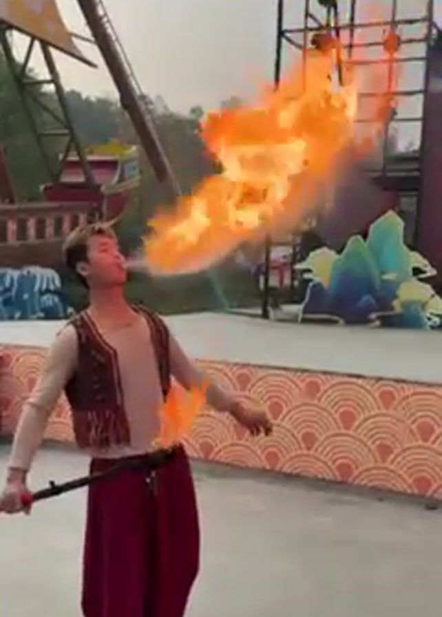 A man in costume performs on stage. He wears a light shirt, a brown vest, maroon pants, and white sneakers. He spits a large burst of fire. He then takes a fire stick and spins it around. A large screen behind him displays red and black graphics, as smoke is released from the stage. The stage is decorated with orange geometric patterns. There are also elements of Chinese architecture and a ship ride visible in the background.
