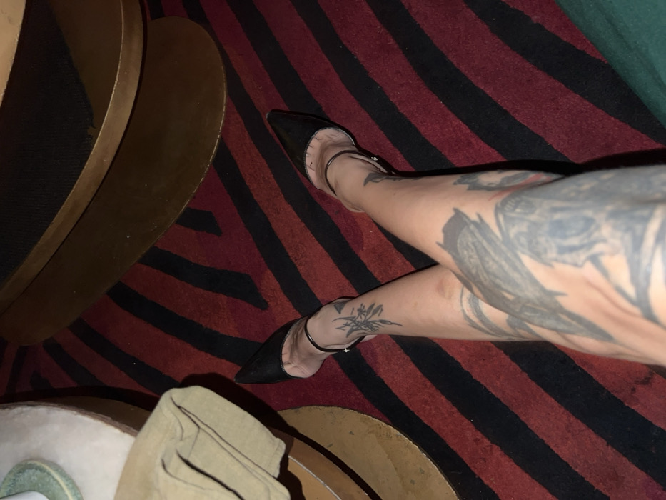 A person's legs, crossed at the knees, are adorned with tattoos. The legs are clad in black, pointed-toe heels with ankle straps. The background features a red and black striped floor with a section of upholstered furniture visible along the side.