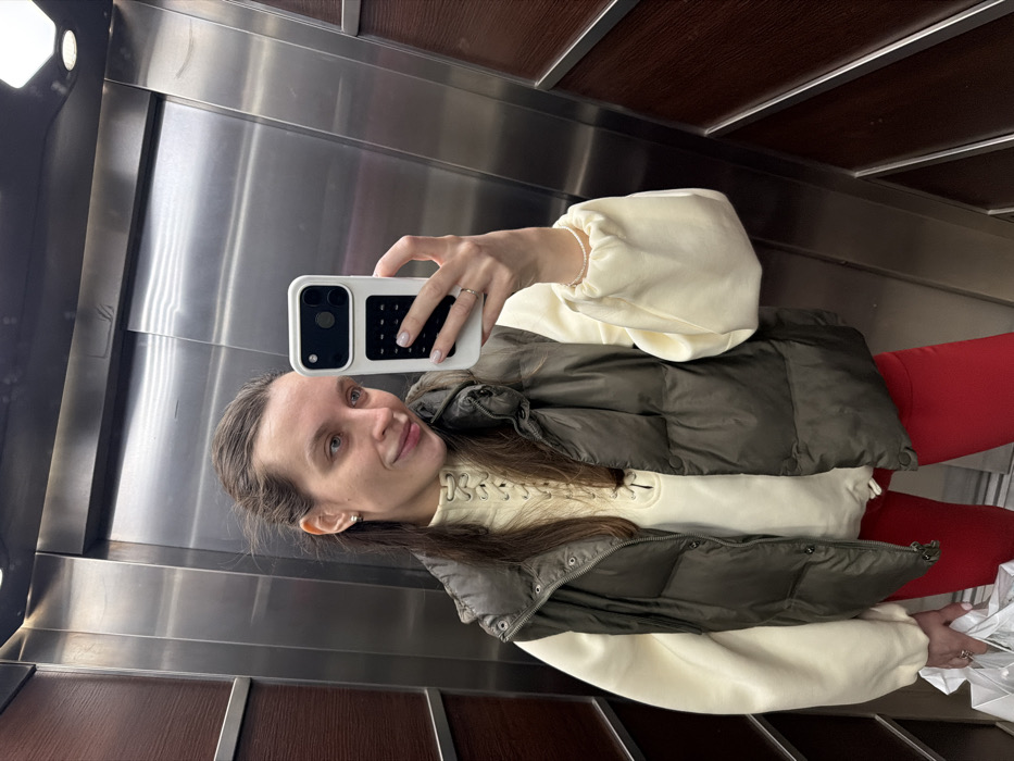 Inside an elevator in Donji Pobori, Montenegro, a young adult female is captured in a mirror selfie. She has long, dark brown hair, light eyes, and a slight smile. She is dressed in a cream-colored long-sleeved top with a lace-up V-neck, an olive green puffer vest, and red pants. A small silver-colored earring is visible in her left ear, a light-colored bracelet on her right wrist, and a simple ring on her right ring finger. Her right hand holds a white smartphone, fitted with a white and black protective case, used to take the photograph. Her left hand, partially visible at the bottom left, holds several white shopping bags. The elevator interior features brushed metal panels on the left and center, comprising the doors, and dark wood-grain panels on the right. A square, recessed light fixture is visible on the ceiling.