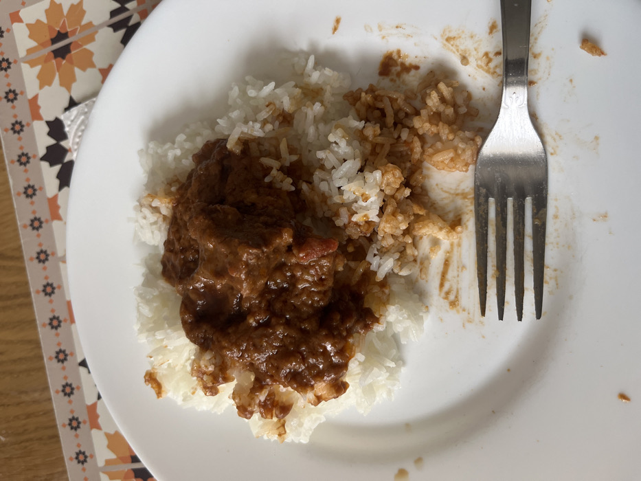 An overhead photograph captures a partially consumed meal on a white, circular plate, located in Champs-sur-Marne, France. The plate contains white rice, approximately half covered by a reddish-brown stew or curry with discernible solid components. A silver-colored metal four-tine fork, soiled with food residue, rests horizontally in the lower right portion of the plate, indicating prior use. The plate sits atop a placemat exhibiting an orange, brown, and off-white geometric pattern, beneath which a light-colored wooden surface is visible. No individuals are present.