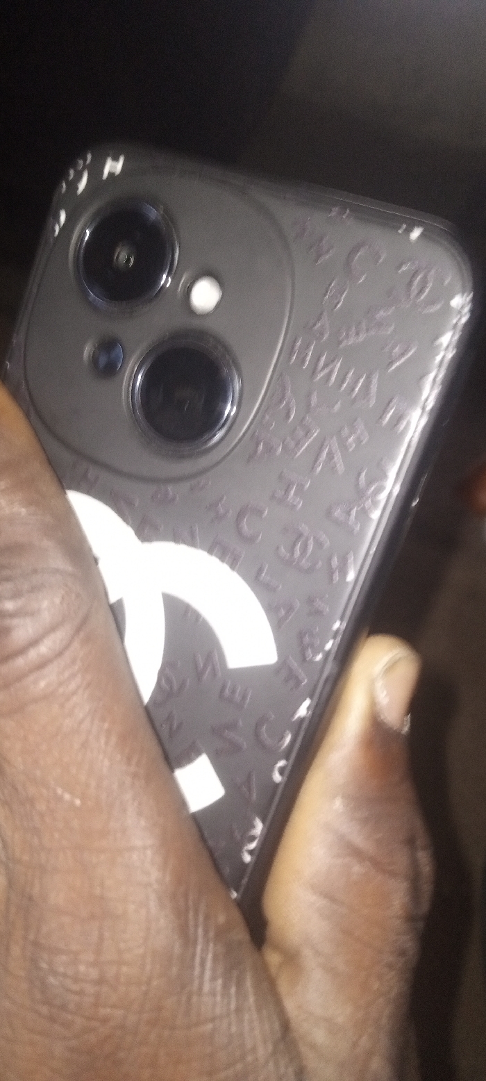 **Location:** Unknown, Unknown A close-up, low-light image depicts a dark-skinned hand holding a smartphone. The smartphone, possibly an iPhone, is oriented vertically with its rear facing the viewer. It is encased in a dark grey or black protective cover. The cover features a large, prominent white "CC" logo (Chanel) in the lower left quadrant. The rest of the case is patterned with smaller, embossed or printed text and logos, including repetitions of "CHANEL" and the "CC" motif in a lighter shade. The phone's dual-camera system and a white flash are visible in the upper left of the device. The edges of the phone case show signs of wear, with small white marks indicating scuffs. The hand, specifically the thumb and part of the index finger, has a dark brown complexion with visible skin texture and wrinkles. The background is uniformly dark and out of focus, suggesting an indoor setting with limited illumination.