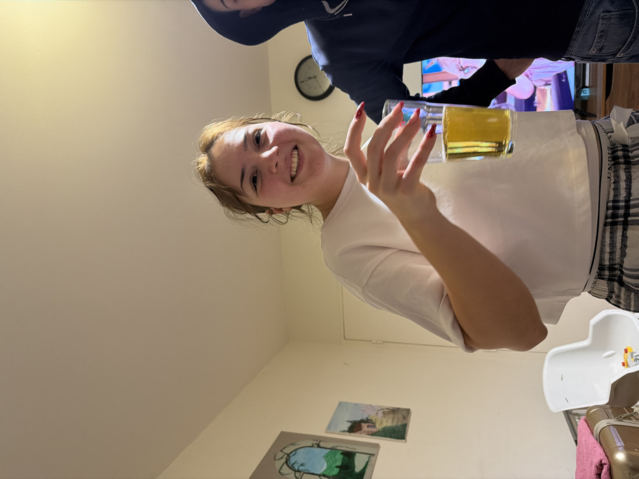 A woman smiles, holding a glass of yellow liquid, likely beer. She has long red nails. Behind her, another person wears a hoodie. A clock hangs on the wall near a TV screen showing blurry images. The background includes a white baby bathtub, paintings on the wall, and a suitcase. The room appears to be a living space, possibly in a home or apartment. The angle of the shot is from below.