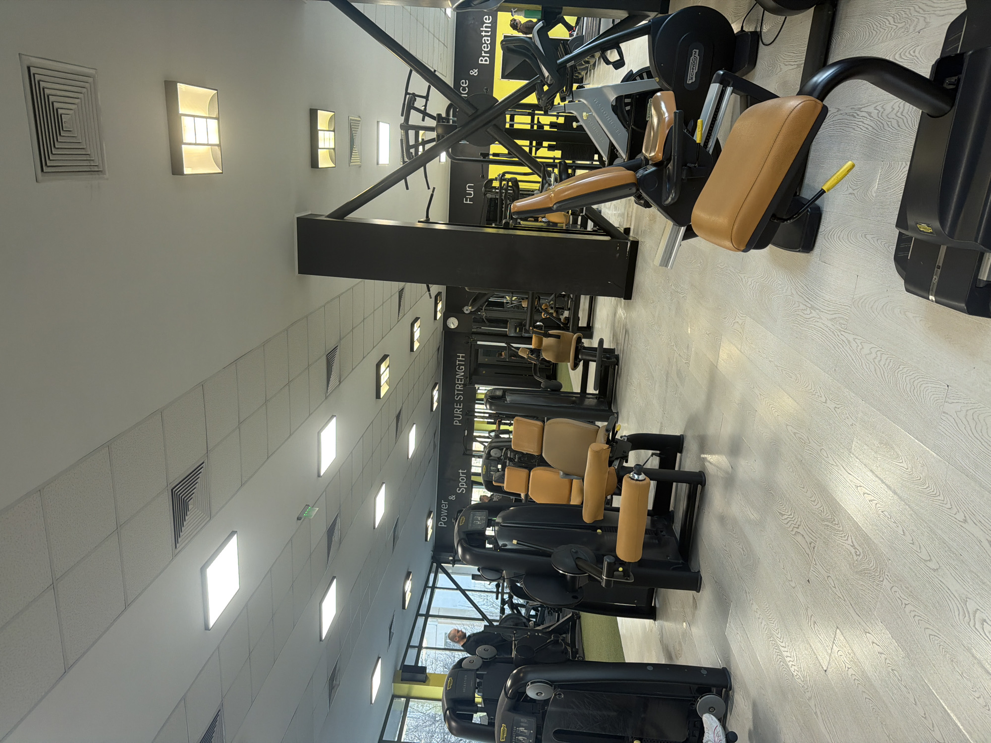 The image depicts the interior of a fitness gym located in Plovdiv, Bulgaria. The spacious facility features a light-colored, possibly laminated, wooden floor throughout most areas, transitioning to a dark green artificial turf near large windows on the left. The ceiling is a white grid tile system with numerous square LED panel lights and several rectangular HVAC vents. Some older, recessed rectangular luminaires with diffusers are also visible. The walls are predominantly black, adorned with yellow accents and white motivational text, including "Power & Sport," "PURE STRENGTH," "Fun," and "ice & Breathe." Tall, black support columns are interspersed throughout the room, along with black structural cross-beams and pull-up frames. Various fitness machines, primarily from the Technogym brand, are arranged across the floor. In the foreground and mid-ground, numerous black-framed selectorized strength training machines with tan/orange padded seats and rollers are visible, including leg extension/curl and chest press apparatuses. To the immediate foreground right, a Technogym recumbent exercise bike with a tan/orange seat is present, and another partially visible cardio machine (likely a treadmill) is in use further back on the right side. Two individuals are visible: a male with short, dark hair, wearing a dark long-sleeved shirt and dark pants, stands in the mid-ground left near the windows. A second, partially obscured individual is seen from the chest down on a treadmill in the background right, wearing dark attire, with a green water bottle positioned nearby. The large windows on the left offer a view of exterior trees and a building facade. A wall clock and a green emergency exit sign are also discernible in the background.