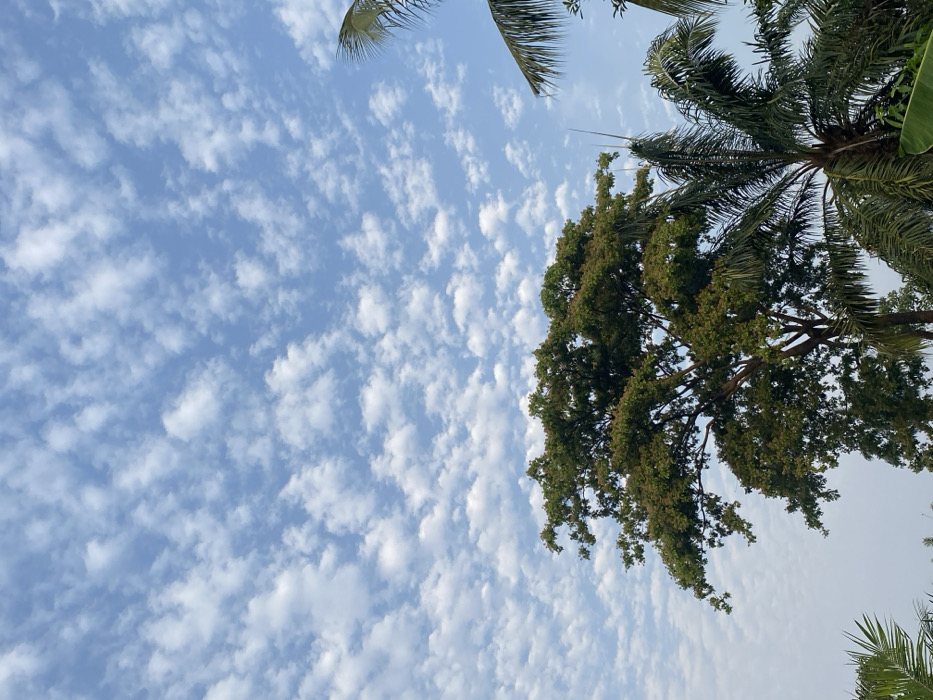 A sky filled with rippling, small clouds dominates the scene. Green foliage from various trees occupies the upper right and top edges. A few palm fronds are visible. The trees' leaves appear dense and create a shaded area against the bright sky.