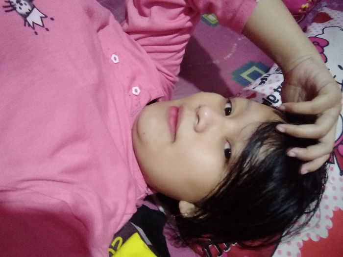 - "A young girl with dark hair lies on a bed covered with a pink and patterned sheet" by FM-kh49F3, licensed under CC BY 4.0