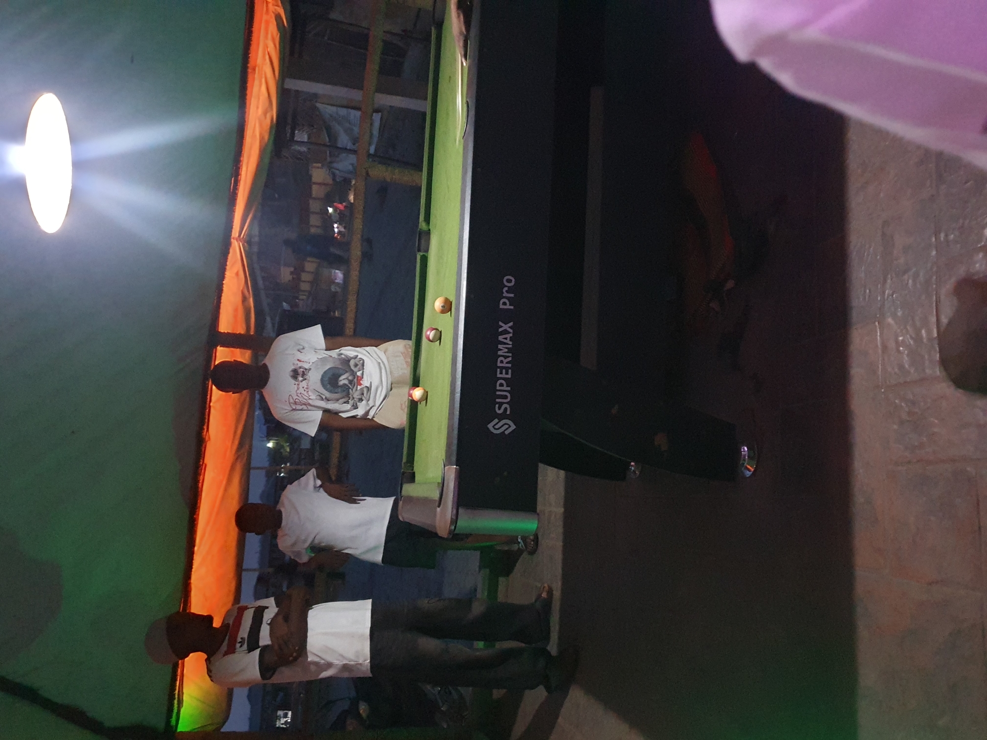 The image depicts an outdoor or semi-enclosed pool game area at night in Lokoja, Nigeria