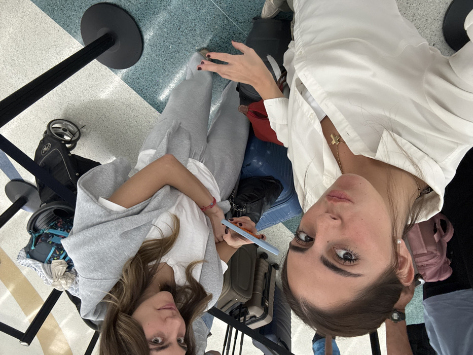 The image depicts two young adult females within an indoor waiting area, likely an airport in San Antonio, United States, given the context clues