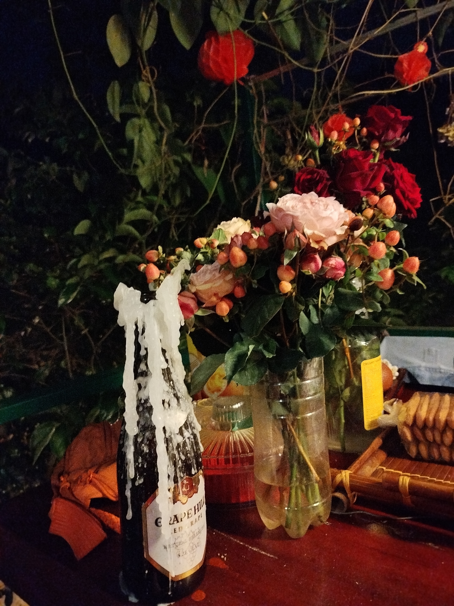 nighttime still life outdoors, likely in Cam Ly, Da Lat, Vietnam. On a dark red wooden surface, a black wine bottle is heavily coated in white candle wax. To the right of the bottle are three containers holding a bouquet of roses in shades of red and pink, interspersed with orange berries. These containers appear to be a glass vase, a plastic bottle, and another clear vessel, the latter filled with a reddish liquid. Behind the bouquet are leafy green plants. In the background, a few red Chinese lantern flowers hang from branches. An orange cloth drapes beside the wine bottle, and a wooden instrument and some biscuit-like food items are partially visible to the right of the bouquet.