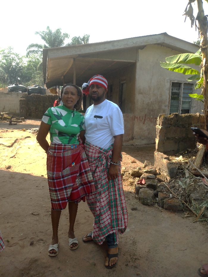 An outdoor scene in the city of Unknown, Unknown, depicts two adults posing for a photograph. On the left, a medium-complexion female wears a green and white patterned short-sleeved top and a red and white plaid wrapper secured with a blue and silver brooch; her hands are clasped behind her back, and she wears light-colored sandals. To her right, a bearded medium-complexion male wears a white short-sleeved shirt, a red, white, and green plaid wrapper over blue jeans, a red and white striped knit cap with red and black pom-poms, a dark beaded bracelet, and dark sandals. Both individuals face forward, looking towards the camera. In the background, a weathered, light-colored single-story building with a flat or slightly sloped roof extending as a porch overhang is visible. Red text, appearing to be "MUJOBA," is written on the building's wall. The ground is unpaved dirt with scattered bricks and debris. On the far left, multiple dark water storage tanks are situated behind a low wall, with green trees in the distance. On the far right, a banana plant with large green leaves partially obscures a hand holding a dark smartphone.