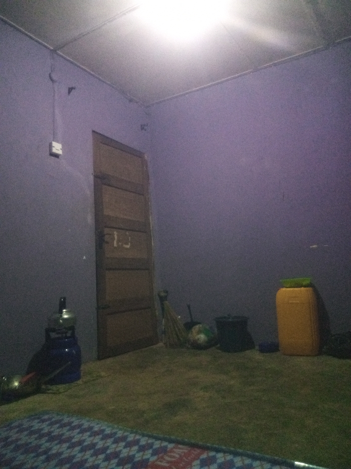 A dimly lit room, painted in shades of purple, contains a collection of objects. A brown wooden door stands against one wall. Beside it, a blue gas tank and a broom are visible. Scattered on the floor are a soccer ball, a black bucket, and a yellow plastic container. The floor itself appears worn, and in the foreground, a checkered mattress is partially visible. A single light source illuminates the scene from above.