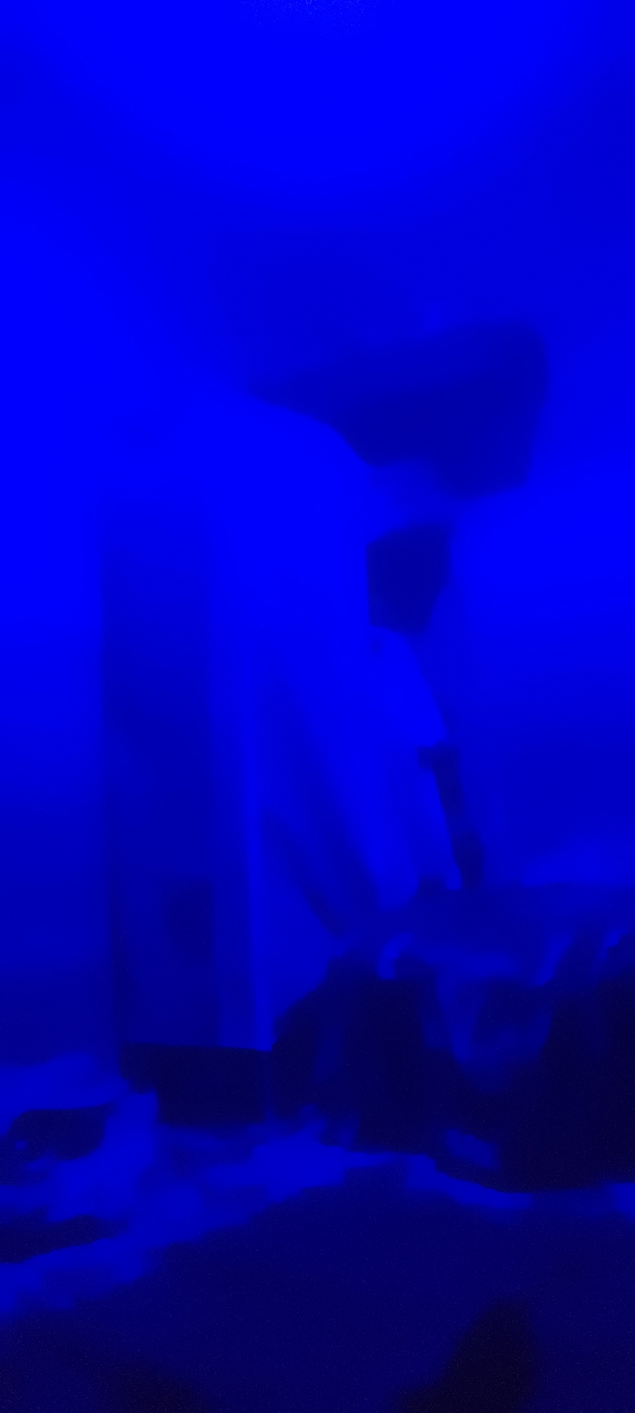 An object, possibly rectangular, is illuminated with intense blue light. The light creates strong shadows and obscuring details, although the shape hints at clothing draped or worn. The lower portion of the image shows darker, undefined shapes, maybe the ground. The darkness and blue tone make it difficult to distinguish objects.