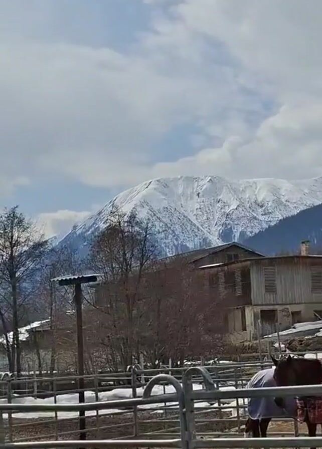 horse pen with two horses wearing blankets standing inside. The pen is made of metal bars and the ground is dirt and patches of grass. In the background, there is an old wooden building and several other houses, along with snow-covered mountains under a sky with clouds.