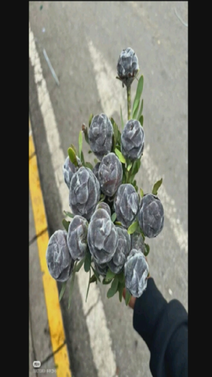 A bouquet of grey-tinted Protea flowers with green leaves is held by a person in a black sleeve. The bouquet features several round, fuzzy buds, some more open than others. The background is a grey asphalt road with a yellow line. The image appears to be taken outdoors on a slightly overcast day.