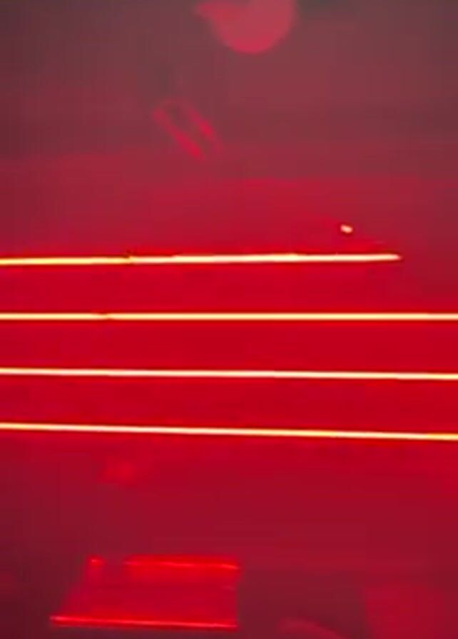 dimly lit room, heavily tinted in red light, seemingly in a club or event setting. There are four long horizontal red light bars on one wall. Some spherical objects are visible in the ceiling. The camera pans to show a person in a light-colored shirt standing in the crowd, also appearing red due to the lighting. The person's back is to the camera, and they appear to be moving or dancing slightly. The background is blurry and indistinct due to the low light and camera movement.