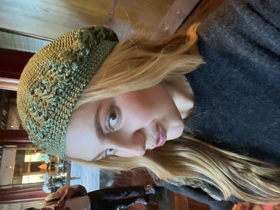 The image depicts a female subject in the foreground within an indoor setting, identified as Chengguan District, China. The female, with long blonde hair, is wearing a dark gray, textured long-sleeved top and a light green, patterned beret. Her head is slightly tilted, and her lips are pursed in a slight pout, while she looks directly towards the viewer with light brown eyes. A thin metallic chain is visible around her neck, and a green woven strap or handle can be seen over her left shoulder. In the blurred background, to the left, a male figure wearing a light-colored shirt and dark pants is partially visible, holding a smartphone. The environment features dark, reflective flooring and warm-toned architectural elements, including what appear to be wooden columns or door frames. Further in the background, a brightly lit area with a table displaying a white floral arrangement suggests a lobby or reception area.