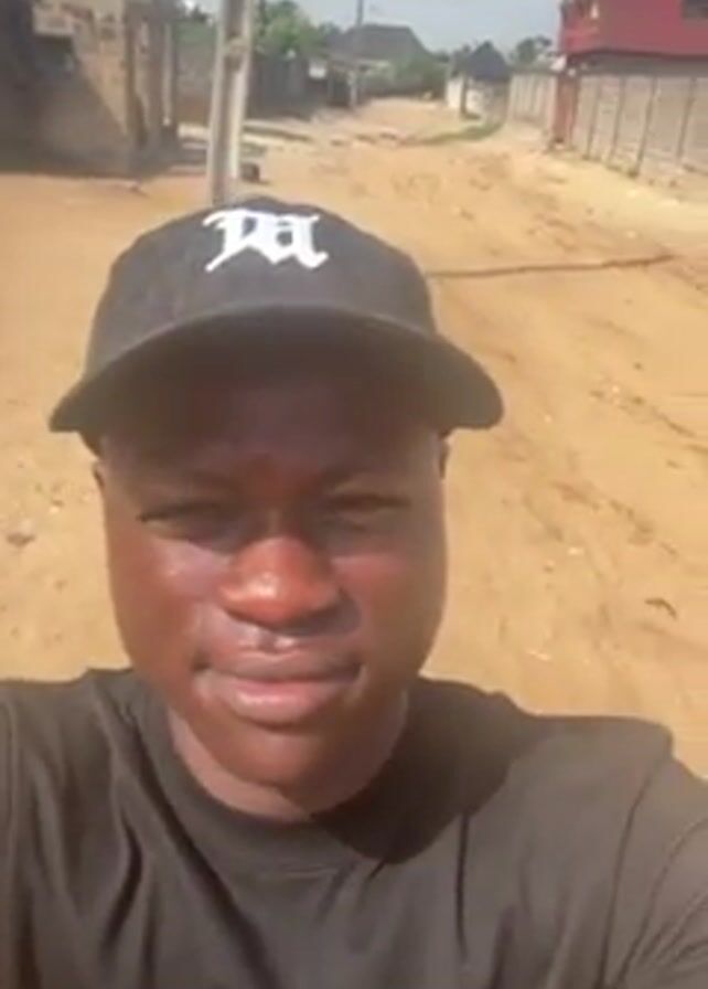 A young Black man wearing a black t-shirt and a black baseball cap with white lettering is walking down a dusty, dirt road in a residential area. The camera is held up close to his face, suggesting he is taking a selfie video. Behind him, there are houses with brick walls and corrugated metal roofs. Utility poles with wires are visible overhead. The sky is bright, suggesting it is daytime.