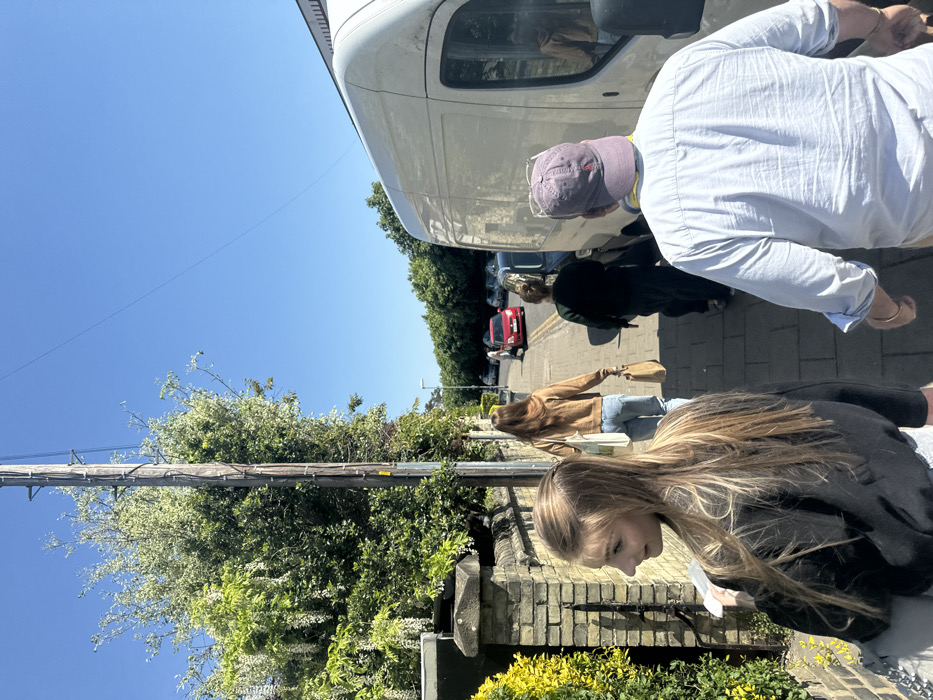 street scene in Cambridge, United Kingdom, specifically at the coordinates 52.201, 0.135. A group of people walk along a narrow street lined with a row of houses on one side and a large white van parked on the other. A young woman with long brown hair walks in the foreground, looking at the camera. She is wearing a black jacket over a grey shirt. Behind her, a second woman with long brown hair, wearing a brown sweater over a white shirt and jeans, is walking toward the camera. A third woman in the image, wearing a dark jacket, walks in the distance on the left side of the image. A man in a white shirt and a grey cap stands to the right of the parked van, walking toward the camera. He is carrying a yellow object beneath his shirt. A red car is visible in the distance, parked in the street on the right. The day is sunny, the sky is blue, and the trees lining the street are green. A power pole runs up the left side of the image. There is a brick wall on the left, covered with green foliage and flowers. The road surface is grey and rough. The scene is captured at a medium distance, from a perspective slightly behind the woman with the black jacket.