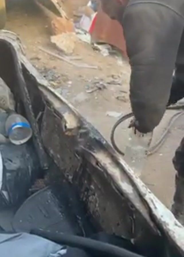 A man in a grey and black jacket stands in a junkyard next to what appears to be a vehicle frame. The frame is grey and black. There is debris scattered around the ground. The man pours water from a water bottle onto the frame. He then wipes the frame with his hand. The man smiles at the camera.