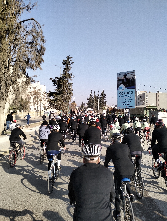 A large group of cyclists rides down a sunny street. Most wear black jackets and helmets. Shadows of the cyclists are visible on the asphalt. Buildings and trees line the street. A large billboard displaying "QCargo" is visible. Some people walk on the sidewalk, and a child runs alongside the group. The sky is clear blue.