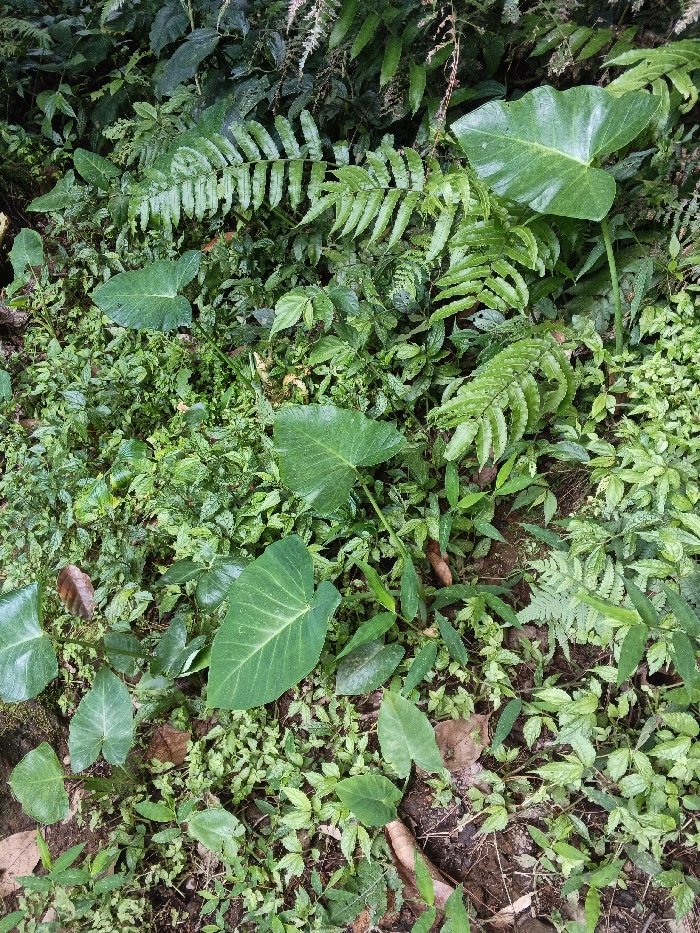 The scene depicts a dense, verdant undergrowth on a forest floor in Desa Mburukulu, Indonesia. No human subjects or man-made objects are present. The ground is largely obscured by a layered carpet of diverse green foliage, with visible patches of dark, moist soil and scattered brown leaf litter. Prominent features include multiple large, heart-shaped or sagittate leaves characteristic of the Araceae family, varying in size and distributed across the frame. Numerous fronds of ferns, displaying segmented leaflets, are interspersed among other smaller, broad-leafed plants and groundcover vegetation. The environment appears lush, humid, and undisturbed, characteristic of a tropical forest ecosystem.