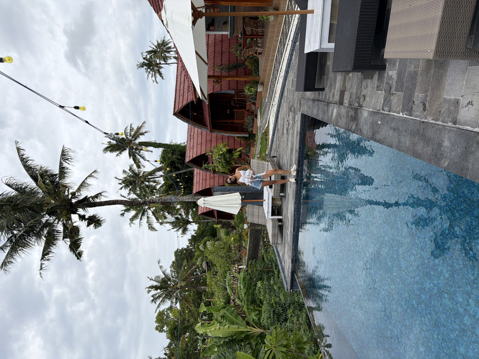An outdoor shot of a resort. Palm trees line the perimeter with a hotel and cabana in the background. A woman stands along the edge of the pool. Light bulbs hang from the trees on a wire. The sky is overcast.
