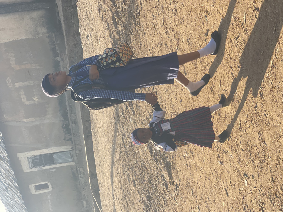 Two school-aged females walk hand-in-hand from right to left across a dusty, reddish-brown dirt path in Muchiya, Nigeria